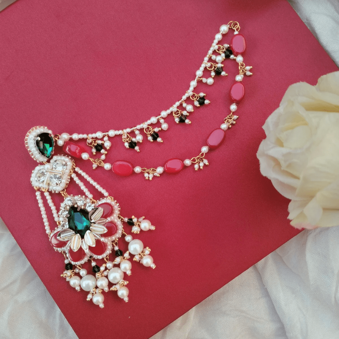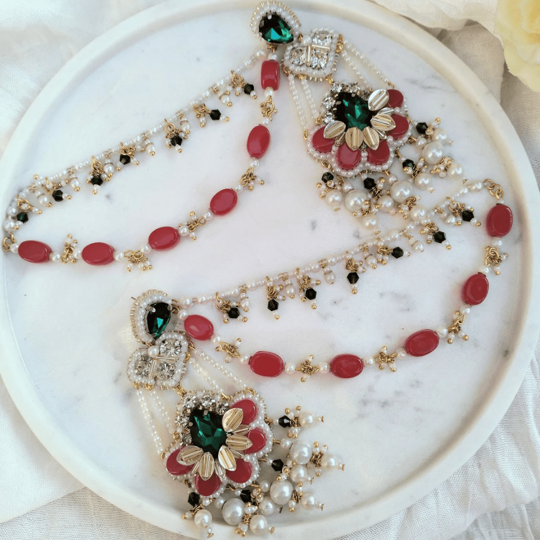 The Dharna Earrings comes with double-layered ear chains adorned with semi-precious stones and pearls, these earrings are perfect for weddings and festive celebrations. Pair them with your lehengas, anarkalis, or sarees for a timeless and graceful statement.