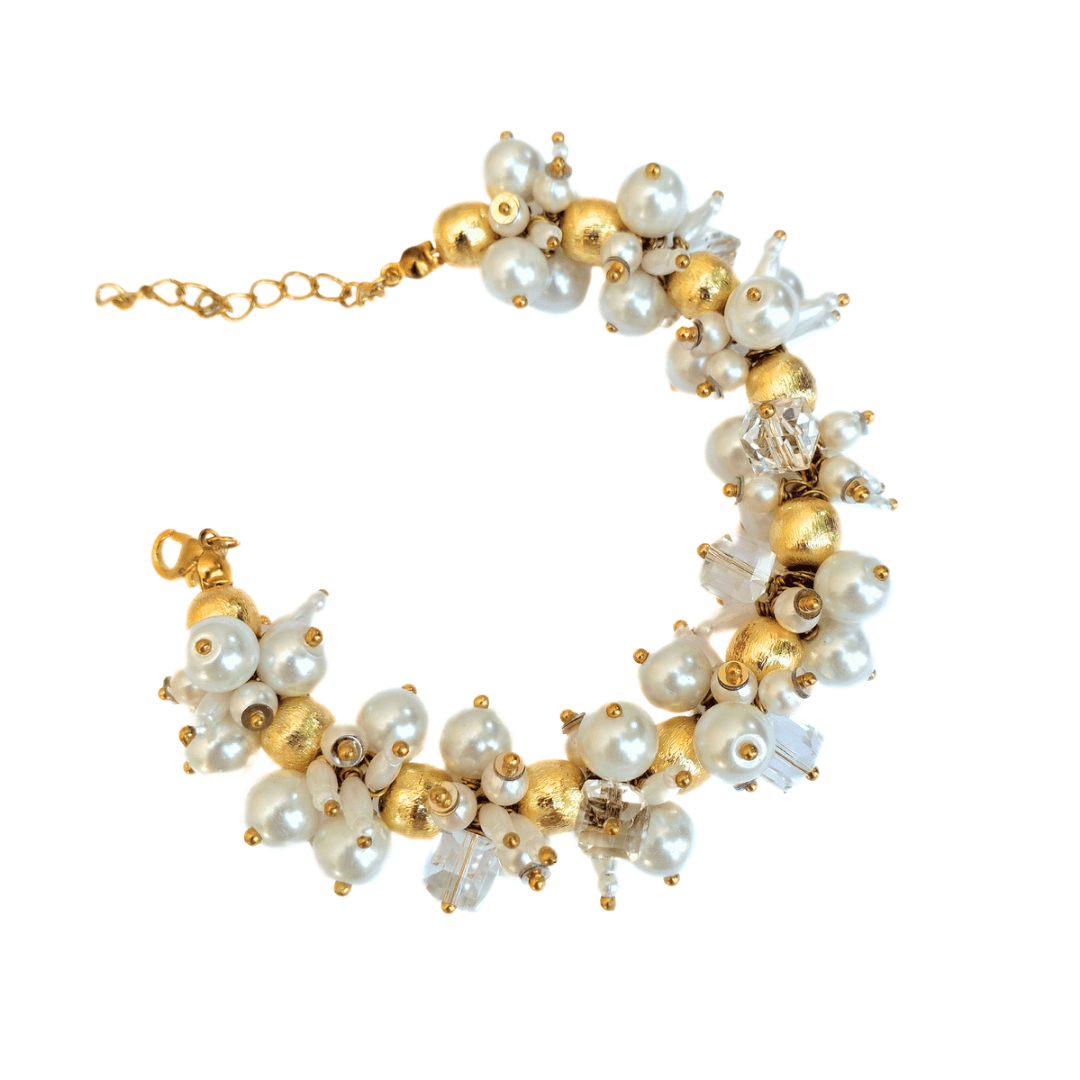 The Mukta Bracelet features a blend of brass beads and glass pearls, perfect for festive occasions. Its elegant design complements traditional attire, adding a refined touch to your look.