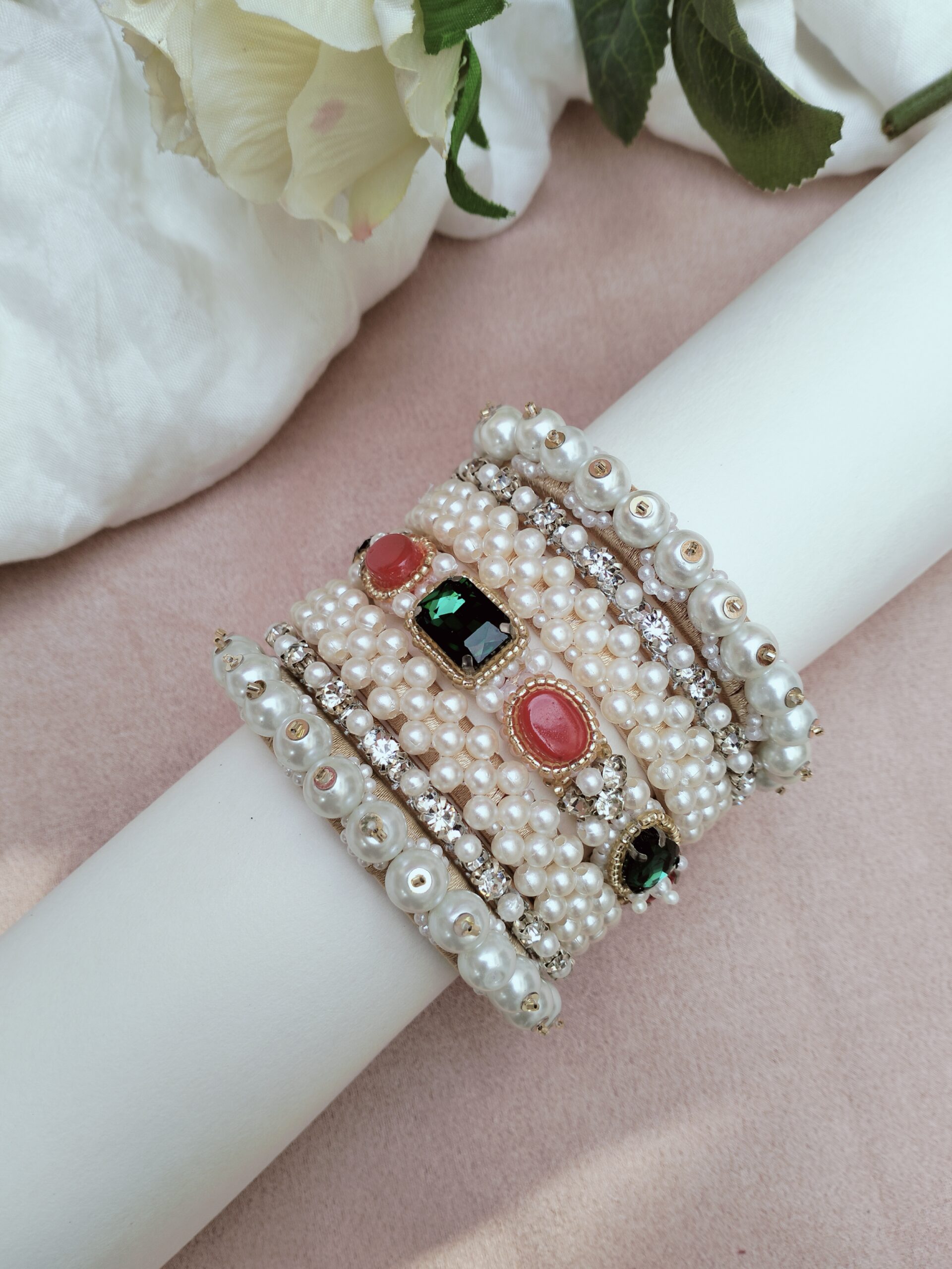 The seven-piece Ratana Bangle Set combines intricate embroidery and pearls in each handcrafted piece. Perfect for traditional sarees and lehengas, these bangles provide a regal and sophisticated touch to any outfit.
